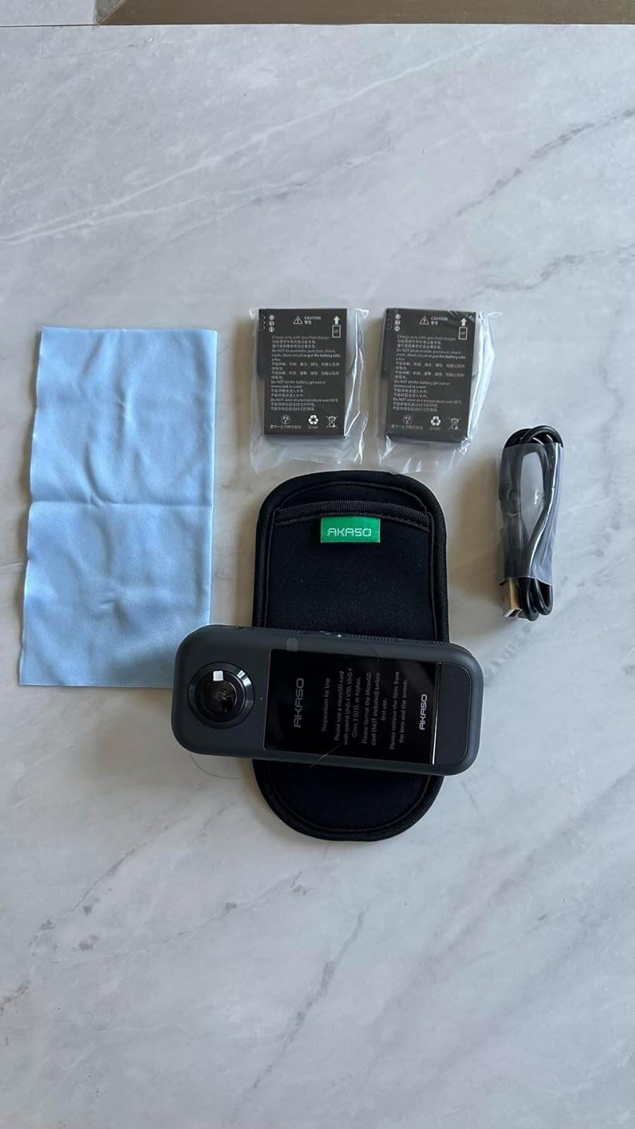 Standard Combo: AKASO 360 x1 / Battery x2 / USB-C Cable x1 / Lens Cloth x1 / Protective Pouch x1 / Quick Start Guide x1