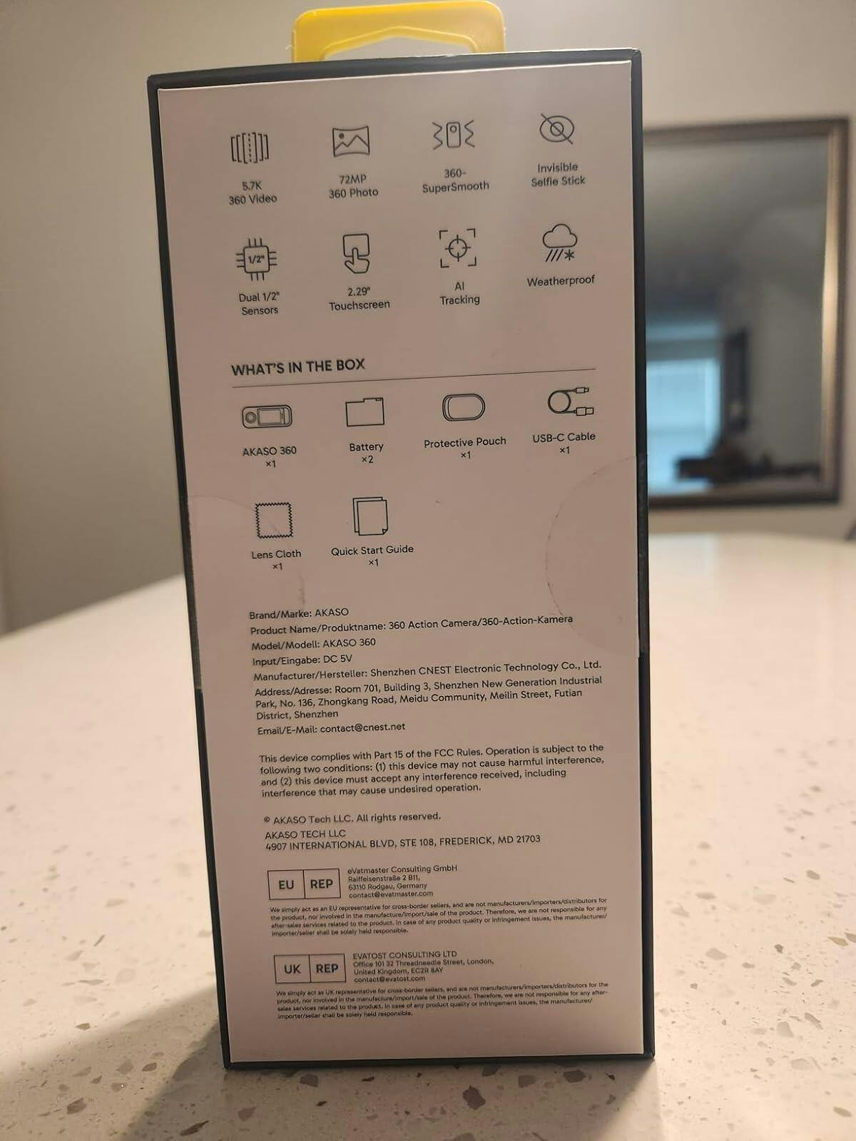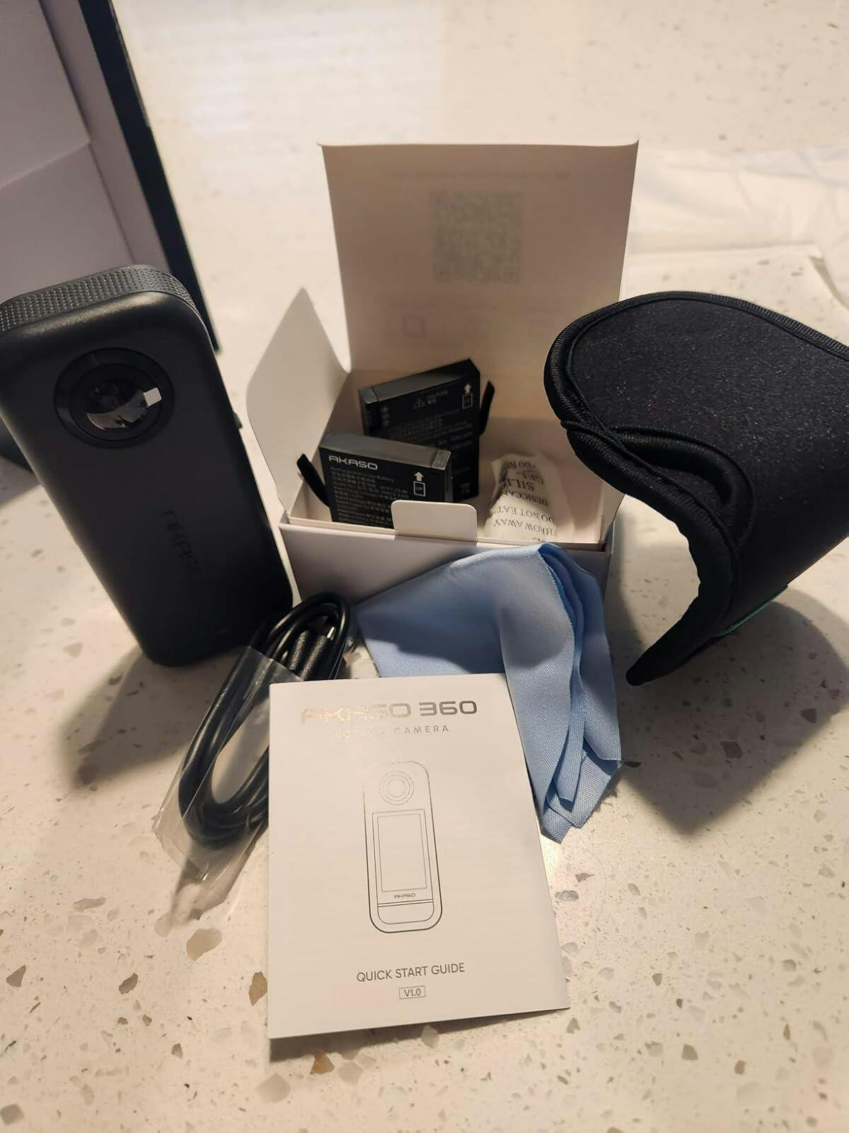 Creator Combo: AKASO 360 x1 / Battery x3 / Multifunctional Charging Case x1 / AKASO Invisible Selfie Stick x1 / Protective Pouch x1 / USB-C Cable x1 / Lens Cloth x1 / Quick Start Guide x1