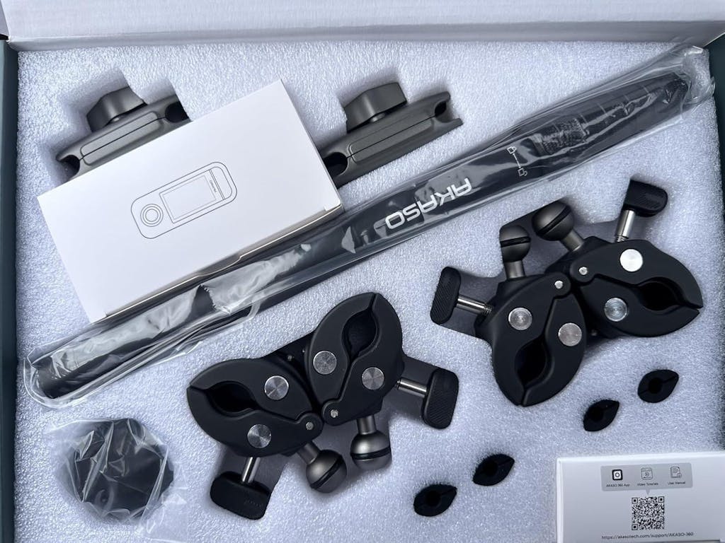 Creator Combo: AKASO 360 x1 / Battery x3 / Multifunctional Charging Case x1 / AKASO Invisible Selfie Stick x1 / Protective Pouch x1 / USB-C Cable x1 / Lens Cloth x1 / Quick Start Guide x1